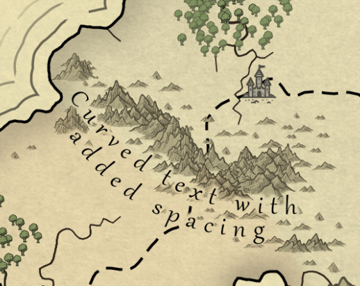 Curving — Text labels can now be curved into an arc or circle, up or down. When you select text in the Text tool, you'll see a "Curvature" slider that lets you control the angle of the arc. Positive values curve the text upward, and negative values curve it downward. This is great for labeling mountain ranges, forests, and other features that run along a curve.